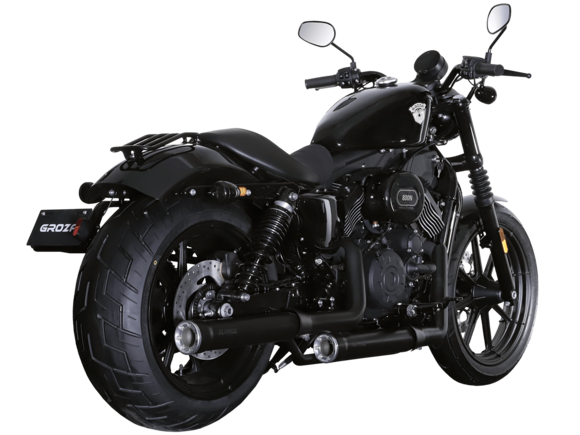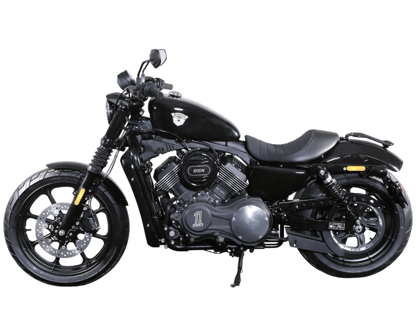 GROZA Toughman 800 – суровый и брутальный круизёр, который сразу обращает на себя внимание в потоке своей схожестью с кастом-байком: спартанской простотой с монохромной гаммой, олдскульными элементами, изящно оформленным двигателем, великолепной выхлопной системой и широченной задней покрышкой.Двухцилиндровый V-образный двигатель объёмом 800 см3 мощностью 61 л.с. при высоких показателях динамики и отличном крутящем моменте способен разгонять аппарат до 160 км/ч. Инжекторный впрыск топлива с инжектором DELPHI увеличивает топливную экономичность, а также позволяет добиться высокой приёмистости и неприхотливости агрегата. Привод на ведущее колесо осуществляется ремнём знаменитой марки USA Gates. Жидкостная система охлаждения не допустит перегрева мотора даже при самом агрессивном вождении.Аппарат имеет 6-ступенчатую механическую коробку передач с классической схемой “1-N-2-3-4-5-6”. На мотоцикл установлены литые алюминиевые диски диаметром 19 дюймов спереди и 17 дюймов сзади. Ширина передней покрышки – 130 мм, задней – целых 240 мм! С неровностями дороги эффективно справляются телескопическая вилка спереди и маятник с двумя газонаполненными амортизаторами сзади. Эффективное и безопасное замедление с любых скоростей обеспечивают гидравлические дисковые тормоза спереди и сзади.Байк обладает внушительным дорожным просветом 160 мм, что позволяет, при желании, съезжать на дороги с худшим покрытием, нежели асфальт. Зеркала не выходят за габариты руля, что позволяет комфортно проезжать на нём в междурядье.Мотоцикл сочетает в себе отличные технические характеристики, комфорт и надёжность, что позволяет вам ощутить настоящую свободу на любой дороге.