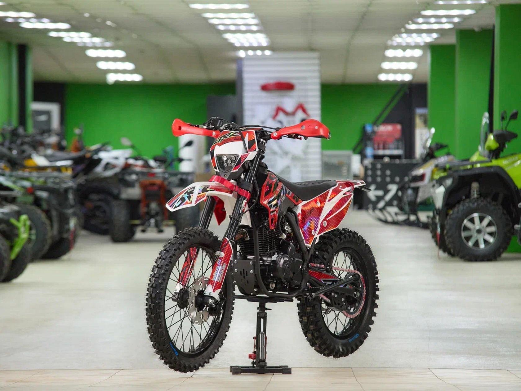 Размер колес21х18Навесное – Руль 28мм алюминиевый. Короткоходная ручка газа. Защита рук. Фрезированные откидные рычаги. Алюминивевые подножки водителя. Алюминиевая лапка КПП. Цепь 520 КМС. Подсос на руле.