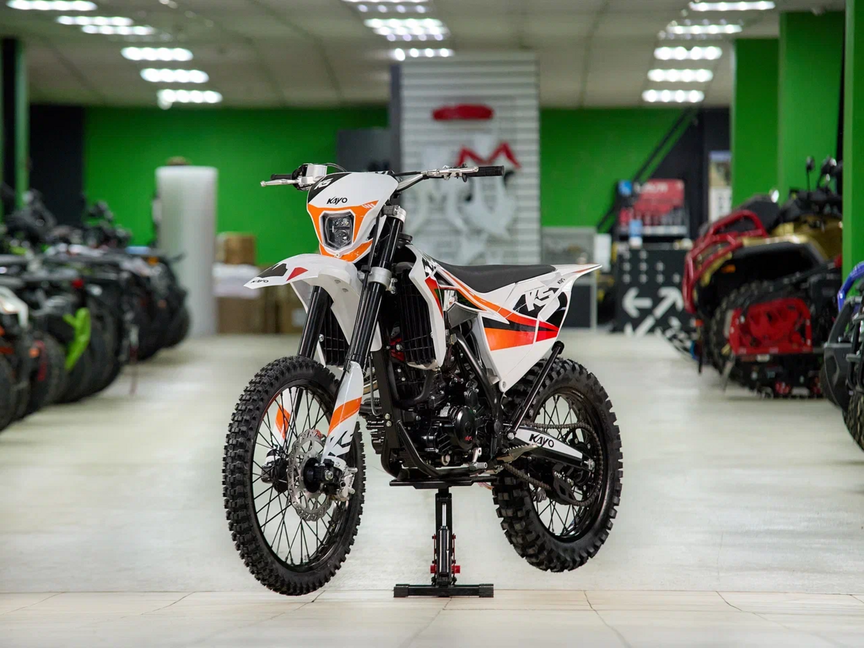 Кроссовый мотоцикл KAYO K5 Enduro – идеальный снаряд для внедорожного экстрима, представляющий собой оптимальный баланс производительности и технической оснащённости, поэтому он идеально подходит как новичкам, так и опытным райдерам. Удобный, простой и надёжный мотоцикл, который полностью оправдывает свою цену.Мотоцикл оснащён одноцилиндровым 4-тактным двигателем (ZONGSHEN NB300/ZS174MN-5) с балансирным валом и объёмом 280 см3, который обеспечивает высокую мощность (27 л.с.) и крутящий момент, что позволяет развивать большую скорость и с лёгкостью преодолевать трассы со сложным рельефом. Карбюратор NIBBI PWK34 обеспечивает бесперебойную работу техники в самых жестких условиях эксплуатации, простоту и лёгкость в обслуживании, а также неприхотливость к качеству топлива. Жидкостная система охлаждения не допустит перегрева мотора даже при самом агрессивном вождении. Аппарат оснащён 6-ступенчатой механической коробкой передач с классической схемой “1-N-2-3-4-5-6”.Усиленная рама из хром-молибденового сплава разработана фирмой KAYO. Передняя подвеска — регулируемая телескопическая вилка перевёрнутого типа длиной 880 мм, задняя — регулируемый моноамортизатор 470 мм с прогрессией, рассчитанный на высокие нагрузки. Оба компонента подвески произведены фирмой KKE. В паре они позволяют эффективно амортизировать удары при езде по неровностям и препятствиям на трассе. Мотоцикл оснащён классическими спицованными колёсами диаметром 18 и 21 дюйм. Эффективное и безопасное замедление с любых скоростей обеспечивают гидравлические дисковые тормоза.Мотоцикл достаточно компактен, поэтому он комфортен в эксплуатации одновременно и для мужчин среднего телосложения, и для девушек. Байк оснащён системой запуска двигателя при помощи кнопки электростартера или при помощи рычага кик-стартера.Высококачественная износостойкая резина с развитым протектором отлично держит дорогу на различных типах покрытия и в самых разных поворотах. Сиденье эргономичной формы покрыто антискользящим материалом. Данная модель укомплектована очень яркой фарой со светодиодным модулем, которая позволяет кататься и в ночное время.K5 Enduro сочетает в себе отличные технические характеристики, комфорт и надёжность, что позволяет вам ощутить настоящую свободу на любой трассе.