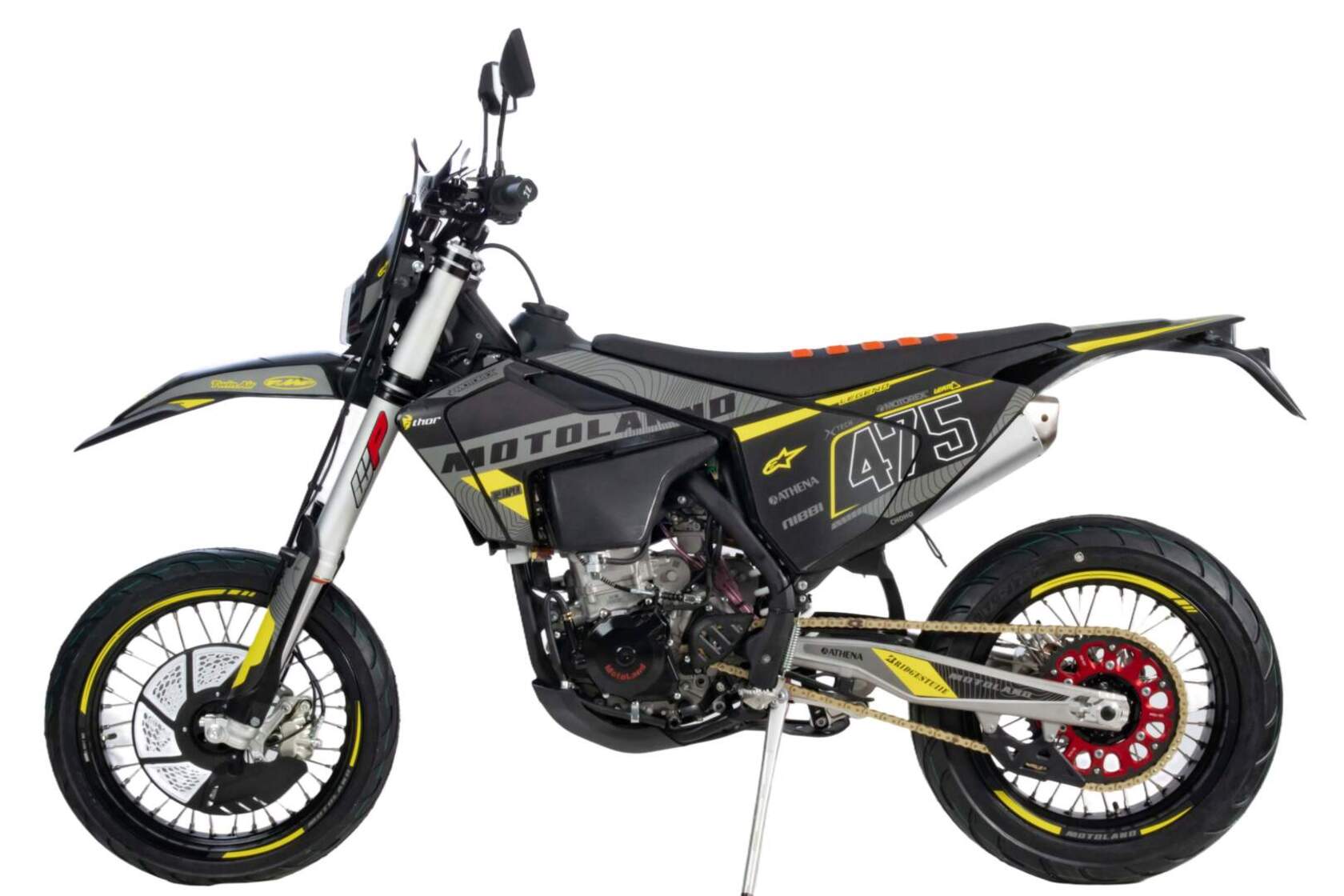 Мотоцикл MOTOLAND 500 XT500 ST 17/17 (мотард) это полноценный «заряженный» кроссовый мотоцикл, но на шоссейной резине. Имеет хорошую проходимость и тяговую мощность за счет установленного 4х тактного двигателя LONCIN 267 MR с рабочим объёмом 500 см³, мощностью 48 л.с. и карбюратором Nibbi 38. Идеален для езды по дорогам общественного пользования, т. к. его сликовые 17 дюймовые шины (110-70) и (140-70) просто созданы для езды по среднему и твердому грунту.Мотоцикл относится к топовой линейке мотоциклов MOTOLAND. Передняя подвеска FASTACE - картриджная(закрытого типа), обеспечивает лучшее качество демпфирования (лучше отрабатывает препятствия) по сравнению с обычными вилками, с зади так же установлен амортизатор FASTACE, с увеличенным выносным бачком, позволяющий настраивать подвеску под разные условия эксплуатации. Ступицы из фрезерованного алюминия обладают высоким сопротивлением к нагрузкам. Большое количество аллюминиевых деталей позволило значительно снизить его вес, который составляет всего 125 кг.
