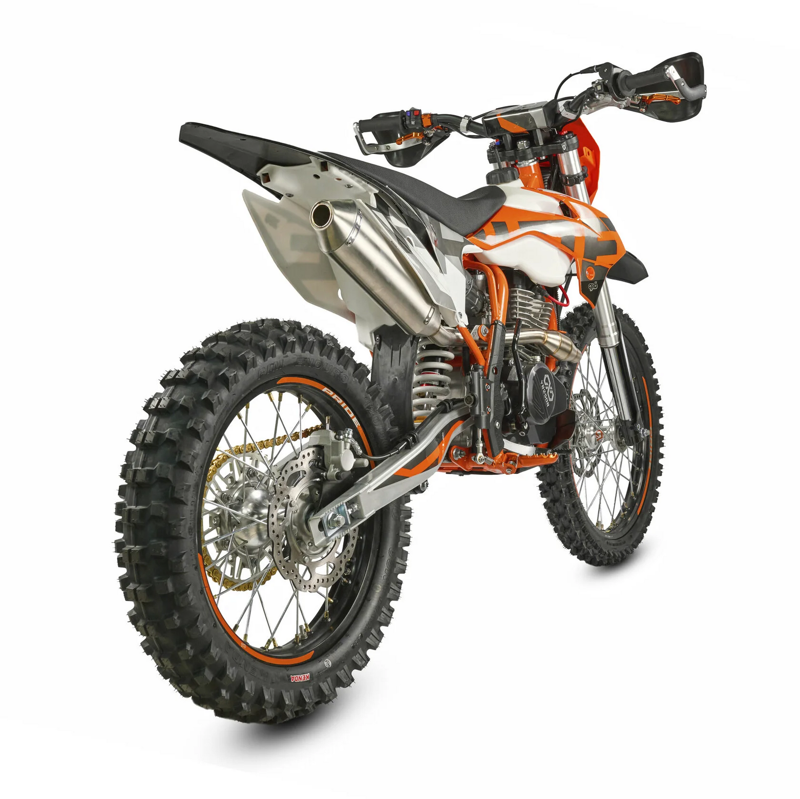 КомплектацияЭлектронная приборная панель, моточасы, подножки «AJ1» (алюминий 6063 с шипами), невозгораемый воздушный фильтр «AJ1» – Twin Air с увеличенной площадью, ведомая звезда «AJ1» (520, алюминий 7075-Т6), защита рук, грипсы OTOM/Lock-On, передние и задние буксаторы «AJ1», откидные алюминиевые рычаги 270, алюминиевая лапка КПП, пульт света КТМ, LED фара 5 линз.ДвигательМодель оснащена 1-цилиндровым 4-х тактным двигателем LONCIN YB250-R с воздушным охлаждением объёмом 249,9 см3, который выдаёт 23 л.с.ПодвескаПередняя вилка "MNT" перевернутого типа 51-54-830/37mm с регулировками. Моноамортизатор "MNT" также с регулировками. Система прогрессии, обеспечивает равномерную, мягкую работу и увеличивает длину рабочего хода подвески. Также ось крепления маятника совпадает с осью крепления ножки. Это существенно улучшает развесовку мотоцикла.КолесаСпереди и сзади установлены антибуксаторы бренда "AJ1", которые притягивают покрышку к ободу, позволяя ездить по бездорожью при низком давлении в камерах, не давая покрышке проворачиваться во время езды. Размер передней покрышки: 80/100 R21. Размер задней покрышки: 120/90-R18. Модель комплектуется "жирной" резиной "KENDA". Все эти характеристики позволяют мотоциклу отлично себя чувствовать в песке и грязи.Тормозная системаПолностью гидравлическая с армированными шлангами. Спереди и сзади установлен двухпоршневой суппорт. Данная конфигурация тормозных механизмов, позволяет быстро и безопасно оттормаживаться даже в самых непростых условиях.Сухой вес мотоцикла 108кг