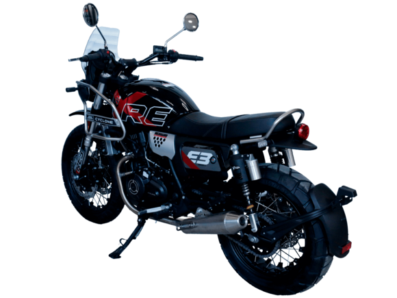 CYCLONE RE3 Scrambler (SR400-A) – универсальный мотоцикл, объединяющий в себе черты городского мотоцикла и эндуро. Управляя им, можно бросить вызов и городским пробкам, и скоростным автострадам, и всевозможному лёгкому бездорожью. Его дизайн отдаёт дань уважения каферейсерской тематике.Двухцилиндровый четырёхтактный двигатель объёмом 401 см3 выдаёт 43 л.с. на 9500 об/мин. Инжекторный впрыск топлива с инжектором BOSCH увеличивает топливную экономичность, а также позволяет добиться высокой приёмистости и неприхотливости агрегата. Жидкостная система охлаждения не допустит перегрева двигателя даже при самом агрессивном вождении. На мотоцикл установлена 6-ступенчатая механическая коробка передач.Максимальная скорость мотоцикла составляет 140 км/ч.Мотоцикл оснащён классическими спицованными колёсами диаметром 17 и 19 дюймов и имеет достаточно большой дорожный просвет – 22 см. С неровностями дороги эффективно справляются телескопическая вилка перевёрнутого типа спереди и маятник с двумя амортизаторами сзади. Ход передней подвески составляет 130 мм, задней – 81 мм. Оба компонента подвески являются регулируемыми. Эффективное и безопасное замедление с любых скоростей обеспечивают гидравлические дисковые тормоза с ABS спереди и сзади.Клиренс мотоцикла составляет 220 мм. Объём топливного бака – 19 л. Снаряжённая масса – 200 кг.На данной модели штатно установлены дуги безопасности, а также имеется бортовой компьютер с цветным дисплеем, USB-порт и подсветка пультов.RE3 Scrambler сочетает в себе отличные технические характеристики, комфорт и надёжность, что позволяет вам ощутить настоящую свободу на любой дороге с любым покрытием.
