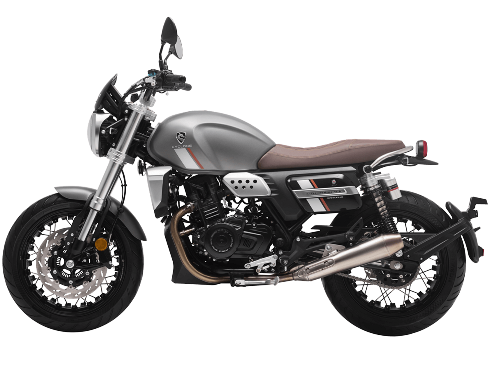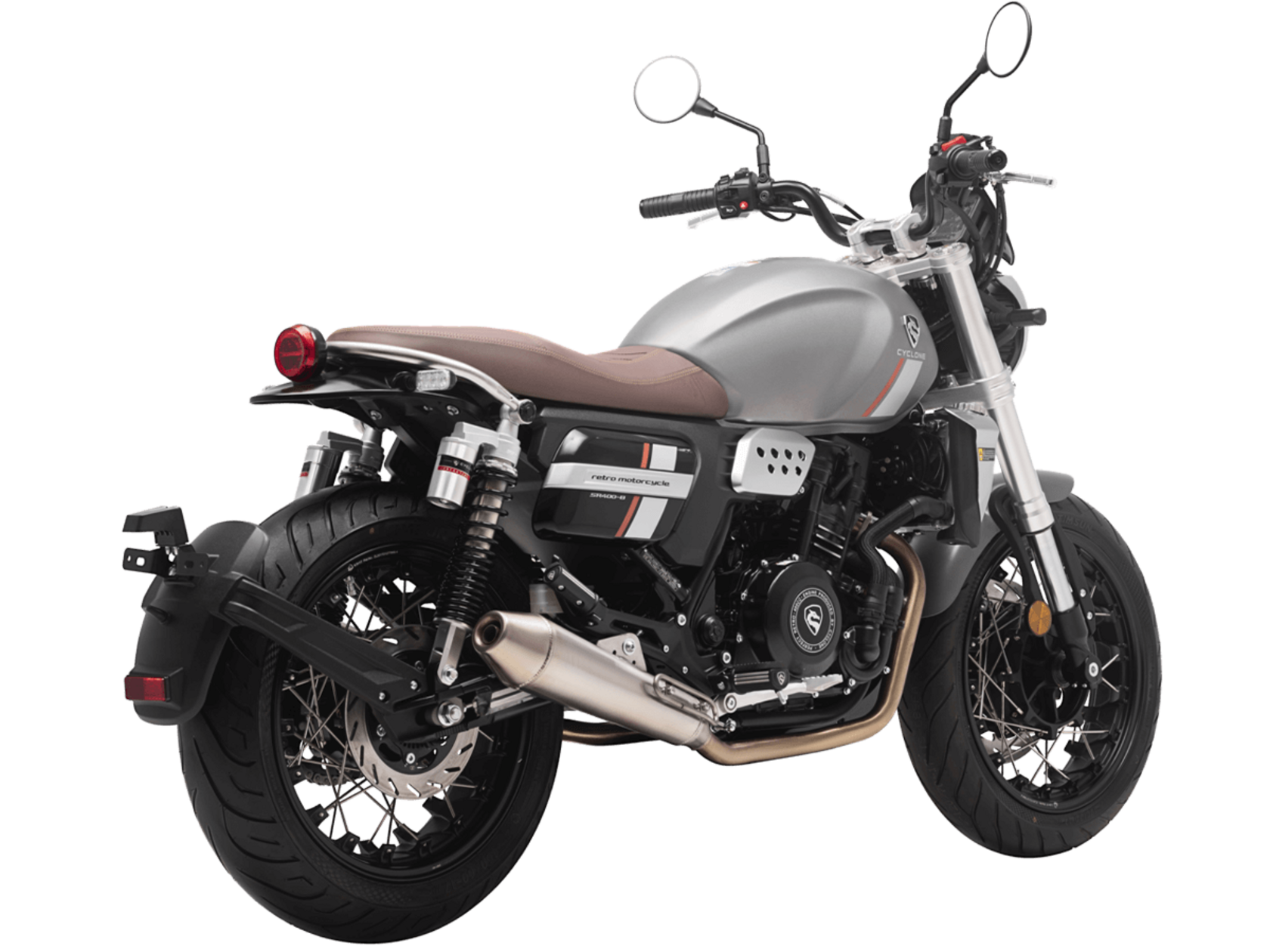 CYCLONE RE401 (SR400-B) 2024 – классик, в котором подчёркнутая простота объединяется с современными технологиями. Данная модель является более продвинутой версией модели RE3 (SR-400) – мотоцикл обладает более современным дизайном, снабжён стильными металлическими накладками на радиатор, а также топливным баком, объём которого увеличен до 20 литров.Двухцилиндровый четырёхтактный двигатель объёмом 401 см3 выдаёт 43 л.с. на 9500 об/мин. Инжекторный впрыск топлива с инжектором BOSCH увеличивает топливную экономичность, а также позволяет добиться высокой приёмистости и неприхотливости агрегата. Жидкостная система охлаждения не допустит перегрева двигателя даже при самом агрессивном вождении. На мотоцикл установлена 6-ступенчатая механическая коробка передач.Максимальная скорость мотоцикла составляет 150 км/ч.RE401 оснащён классическими спицованными колёсами диаметром 17 дюймов. Колёса обуты в бескамерные покрышки TIMSUN. С неровностями дороги эффективно справляются телескопическая вилка перевёрнутого типа спереди и маятник с двумя амортизаторами сзади. Ход передней подвески составляет 130 мм, задней – 81 мм. Оба компонента подвески являются регулируемыми. Эффективное и безопасное замедление с любых скоростей обеспечивают гидравлические дисковые тормоза с ABS спереди и сзади.Клиренс мотоцикла составляет 170 мм. Объём топливного бака – 20 л. Снаряжённая масса – 186 кг.Из дополнительного оборудования можно выделить USB-порт и датчики давления в шинах.Мотоцикл сочетает в себе отличные технические характеристики, комфорт и надёжность, что позволяет вам ощутить настоящую свободу на любой дороге.