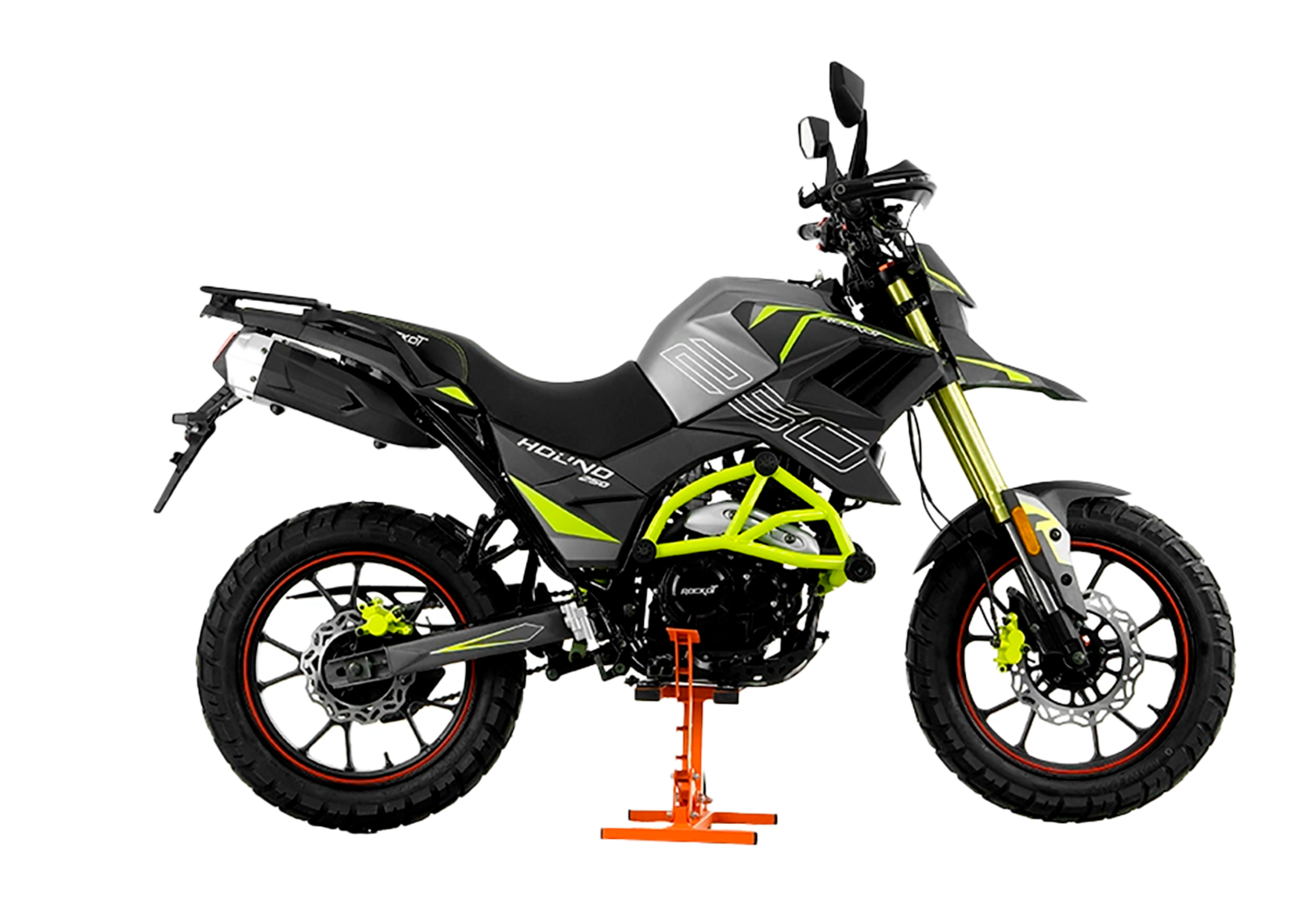 В 2024 году туристический мотоцикл ROCKOT HOUND 250 подвергся серьезным изменениям! Теперь он стал еще более мощным, агрессивным и современным! Изменениям подвергся двигатель мотоцикла, световая оптика, расцветка и другие элементы, способные облегчить жизнь мотоциклиста.ДизайнДизайн мотоцикла ROCKOT HOUND 250 - это симбиоз нескольких мотоциклов разного класса в одном! Так, в зависимости от того, какие на мотоцикле установлены шины, можно смотреть на один и тот же мотоцикл по-разному, и в любом случае он будет выглядеть эффектно!Дизайн облицовки мотоцикла остался прежним: множество граней, острых углов, агрессивные дефлекторы воздухозаборников на боковых обтекателях, LED дневные ходовые огни.Главные изменения в дизайне мотоцикла - это обновленная, полностью светодиодная фара, которая идеально завершает концепцию данного дизайна.Никому не позволят пройти мимо ROCKOT HOUND 250 новые варианты расцветок, которые идеально подчеркивают его формы — это серо-зеленый и бело-оранжевый.ДвигательКак и в предыдущей версии мотоцикла, ROCKOT HOUND 250 все также оснащается 4-х-тактным двигателем от ведущего мирового производителя двигателей из Китая - LONCIN. В новой генерации мотоцикл оснастили двигателем LONCIN FE250 171YMM. Данный мотор имеет 4-х клапанную систему газораспределительного механизма, воздушно-масляную систему охлаждения, которая выполнена в виде масляного радиатора. Также, преимуществом этого двигателя стоит отметить наличие в конструкции сменного масляного фильтра. Мощность FE250 - 25 лошадиных сил, что будет достаточно для мотоцикла весом 143 кг, как на дорогах, так и за их пределами.Коробка передач - 6-ти ступенчатая, с многодисковым сцеплением. Запуск двигателя осуществляется электростартером. Карбюратор, устанавливаемый в ROCKOT HOUND 250, - это мощный и в тоже время экономичный PZ32, который интуитивно прост как в эксплуатации, так и регулировке. Емкость бака в 13 литров обеспечивает большой запас хода до 350 км.РамаВ основе конструкции мотоцикла лежит дуплексная рама из стали высокой прочности. Геометрия рамы спроектирована таким образом, что вы не ощутите вес мотоцикла при движении на низкой скорости. Это обеспечивает наилучшую управляемость при движении в плотном городском потоке, а также при езде по бездорожью.ROCKOT HOUND 250 оснащен защитной клеткой, которая предотвратит повреждения пластика, а также снизит риск получения травм при падениях.ПодвескаТуристический эндуро мотоцикл HOUND 250 обладает качественной подвеской. Спереди установлена телескопическая вилка перевернутого типа, диаметр штока которой - 37 миллиметров, как у большинства среднеразмерных эндуро. Сзади установлен стальной маятник и моноамортизатор, которые соединены посредством системы рычагов прогрессии.КолесаСпереди и сзади установлены разноширокие литые колесные диски из алюминия, диаметром 17 дюймов. С завода мотоцикл укомплектован туристическими шинами по типу 60/40 (асфальт/грунт), которые являются наиболее подходящими для длительных дальних поездок по любому типу дорожного покрытия. Спереди установлена покрышка 110/90-17, а сзади - 130/80-17.Дополнительные элементыДля вашего комфорта во время повседневных и дальних поездок, мотоцикл стал оснащаться держателем для телефона, который вы сможете заряжать во время поездки через USB-порт, установленный на руле.При поездках по бездорожью, каждый сможет высо
