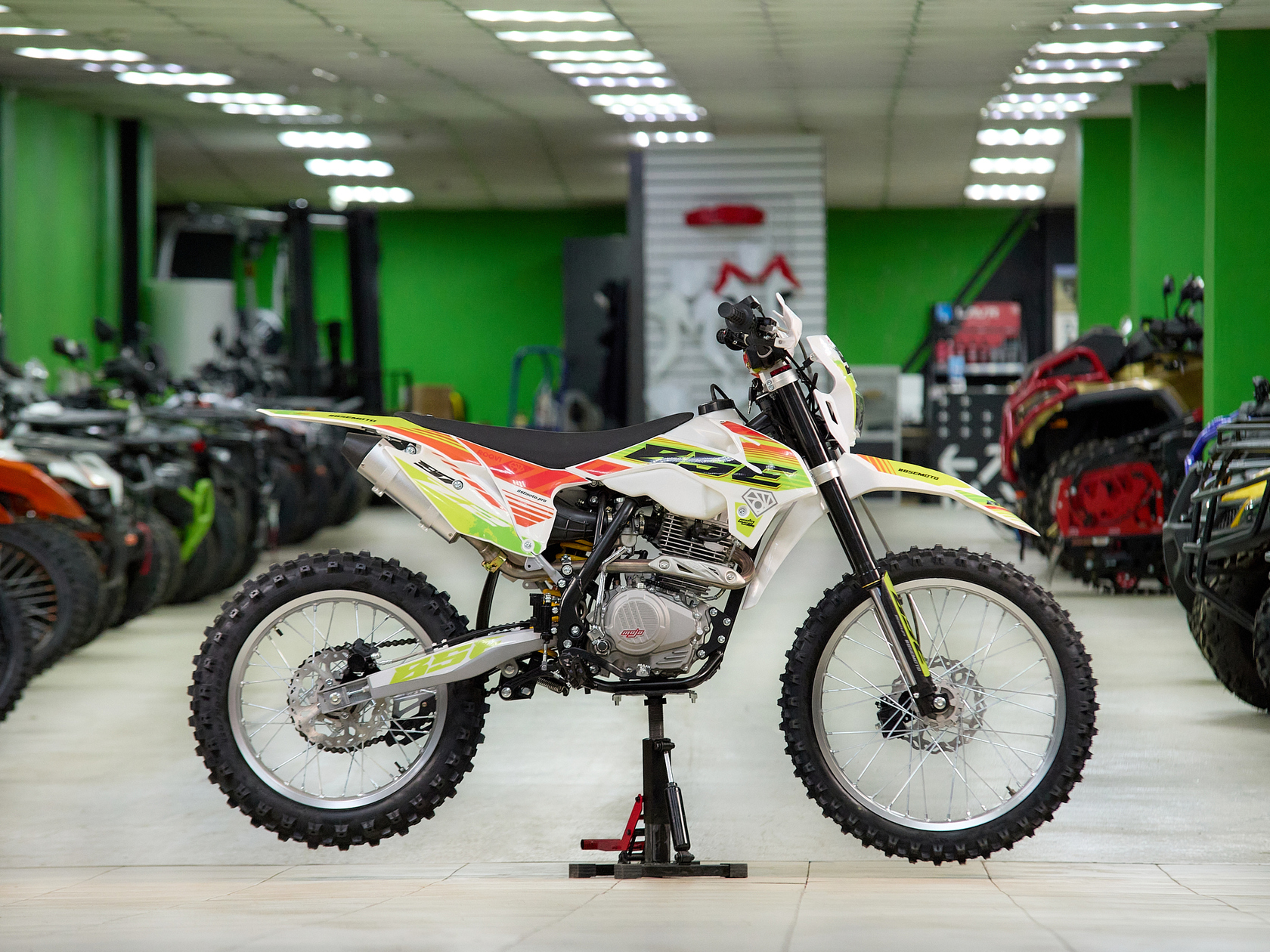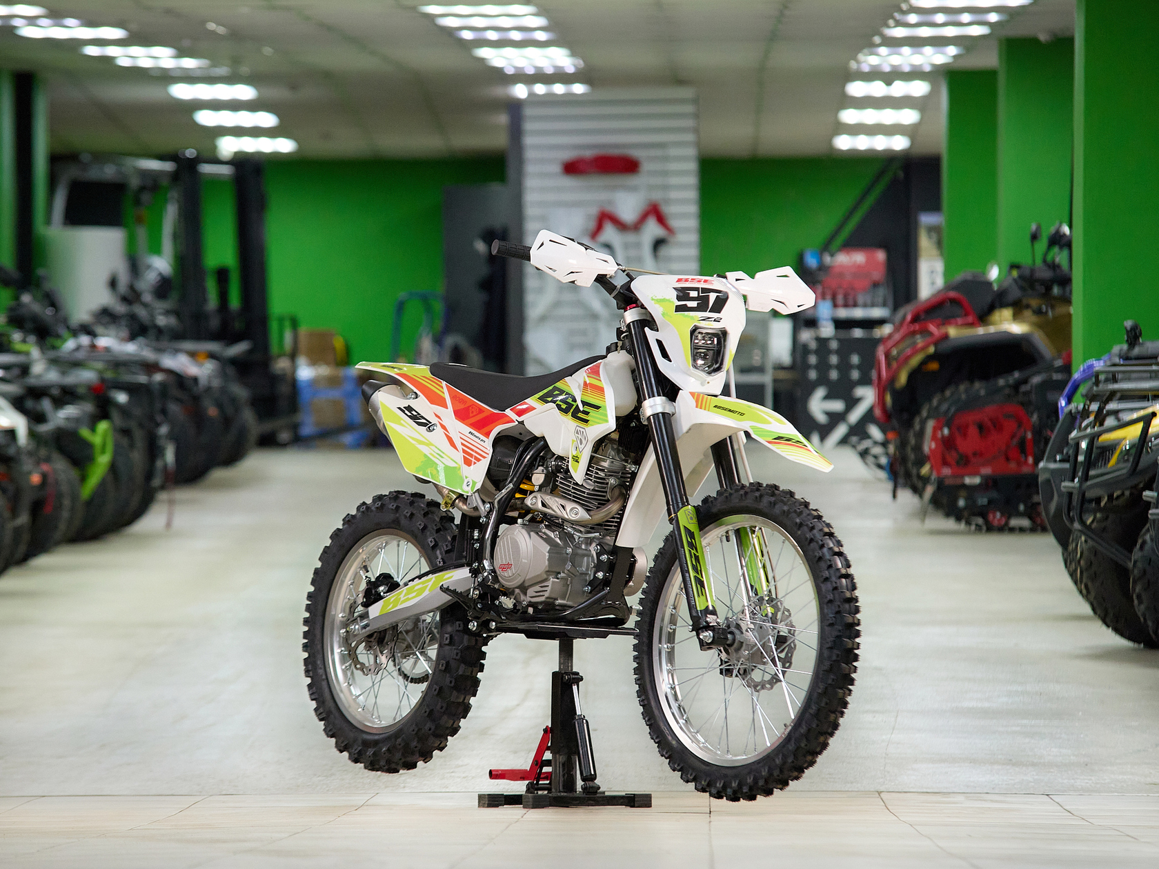Кроссовый мотоцикл BSE Z2 оснащен надежным и экономичным 4-х тактным Zongshen ZS 166 FMM, контролируемая подача мощности благодаря карбюратору Nibbi, отличный отклик дроссельной заслонки на короткоходную ручку газа. Всепоглощающая подвеска, прогрессия задней подвески, прочная стальная рама BSE, вилка перевернутого типа, мощная гидравлическая тормозная система, буксаторы на всех колёсах, внедорожная резина – BSE Z2 не спасует в условиях бездорожья.Комфорт. Этого на BSE Z2 в избытке: LED фара, электростартер, удобное сиденье, широкий удобный алюминиевый руль, защита рук, прозрачный бак.Мотоцикл доступен в 3 цветовых исполнениях: Roqvi Yellow, Roqvi Green и Roqvi Pink.
