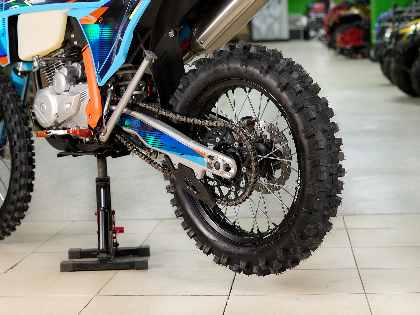 Мотоцикл GR8 F300A (4T CB300RL) Enduro Optimum – отличный снаряд для внедорожного экстрима. Обладает оптимальным балансом мощности, надёжности и управляемости. Мотоцикл приспособлен для суровых условий эндуро заездов. Он готов справиться с любыми маршрутами, которые вы предложите.Одноцилиндровый 4-тактный двигатель CB300RL ZS175FMN с 4 клапанами имеет объём 271 см³, что позволяет достичь мощности в 27 л.с. Для подачи топлива используется карбюратор NIBBI PWK32. Он обеспечивает бесперебойную работу в самых жёстких условиях, прост в обслуживании и неприхотлив к качеству топлива. За поддержание оптимальной температуры отвечает воздушное охлаждение. Механическая коробка передач имеет 5 ступеней и схему 1-N-2-3-4-5. Объём топливного бака 8 литров.На мотоцикле используются колёса диаметром 21 и 18 дюймов, обутые во внедорожные покрышки с агрессивным протектором. Регулируемая подвеска SZC Optima обеспечивает хорошую амортизацию и высокую проходимость. Спереди представлена телескопической вилкой перевёрнутого типа длиной 940 мм, а сзади установлен моноамортизатор длиной 480 мм. Регулируется на сжатие и отбой. За торможение отвечает дисковая гидравлическая система с суппортами SZC. Передний тормозной диск оснащён защитным кожухом.У мотоцикла имеется яркая фара для заездов в тёмное время суток.Габариты 2200х920х1300 мм, вес 116 кг. Высота по седлу 930 мм.Комплектация и внешний вид мотоцикла могут отличаться в зависимости от поставки. Изображение на сайте не гарантирует наличие тех или иных опций. Уточняйте информацию при оформлении заказа.
